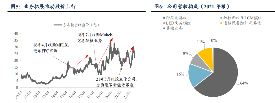 公司从 2016 年开始快速拓展业务线,顺应时代的发展,2016 年 4 月收购 MFLX,2018 年 7 月收购 Multek 完善硬板业务实现快速增长,2016-2018 年归母净利润增速分别达到为 355%,265%,54%,2021 年年报披露公司印刷电路板业务占总营收 64%,电子电路业务成为公司收入主要来源深圳东山精密。