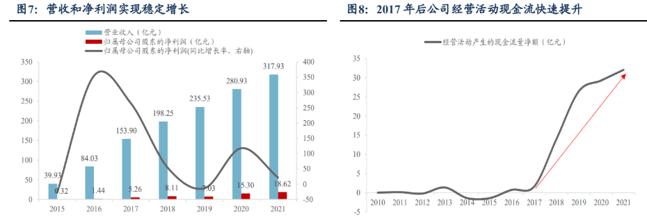 2017 年经营活动产生的现金流金额为 1.61 亿元,2021 年经营活动产生的现金流金额为 32.1 亿元,CAGR 达到 113%,良好的经营性现金流反映公司的产品创收持续高增,得到市场认可,同时有助于公司做好进一步的筹资和投资管理,实现既定的目标深圳东山精密。