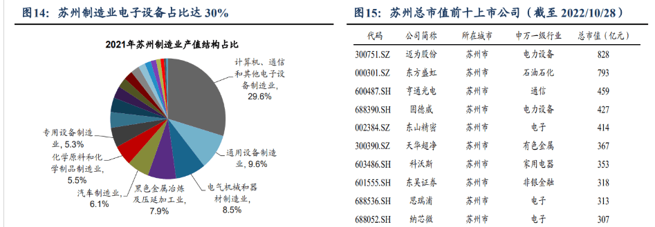 2021 年苏州制造业中计算机,通信和其他电子设备类产值占比总产值 29.6%,居细分项首位深圳东山精密。据苏州统计局公布的《2022 年苏州市情市力》显示,苏州市截至 2021 年新兴产业实现产值 22307.0 亿元,占规模以上工业总产值的比重达 54.0%。