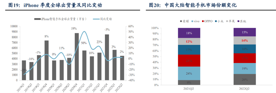 国内传统淡季叠加国内疫情影响下,苹果手机销量继续坚挺,根据IDC数据,2022Q2 中国智能手机出货量约 6720 万台,同比下降 14.7%,其中苹果手机逆势同比增加 0.1% 至 950 万部左右,市场份额提升 2pct 至 14%深圳东山精密。