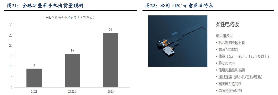 未来折叠屏售价有望下降,一方面,折叠屏技术逐渐成熟,带动成本售价下降,市场需求增加;另一方面,折叠屏手机结构设计灵活,创造出各类特定新需求;折叠屏手机短期销量高增长确定性较高,长期看随着成本及售价的进一步下降,折叠屏有望从高端机向中端机渗透深圳东山精密。随着折叠屏手机市场空间的加大,对于 FPC 行业的发展提供了机会。