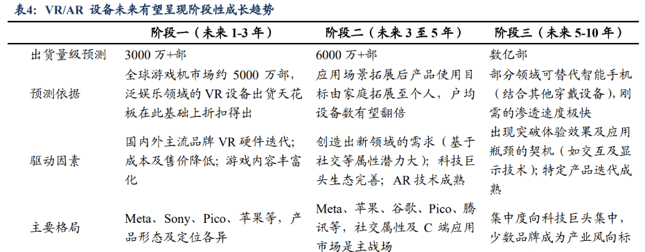 我们认为,硬件迭代+内容成熟是第一阶段的驱动因素,VR 设备在泛娱乐领域的年出货量级有望达到 3000 万部以上;应用场景拓展及科技巨头生态布局构成第二阶段成长驱动,VR 设备成熟、AR 设备进入消费级市场,整体年度出货有望达到大几千万量级;长期来看,随着 VR/AR 设备成为元宇宙重要入口,多领域逐渐刚需,每年出货量级有望突破数亿部深圳东山精密。