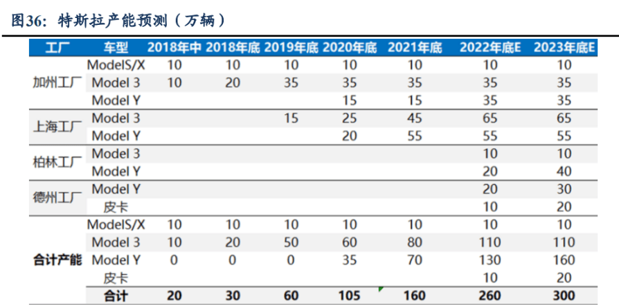 2019 和 2020 年特斯拉分别宣布在柏林和德州新建工厂,彰显扩张决心深圳东山精密。2022 年两座工厂均已投入量产,预计年底柏林工厂实现 Model310 万辆产量、ModelY20 万辆产量,德州工厂实现 ModelY20 万辆产量,皮卡 10 万辆产量,并于未来几年慢慢实现产能爬坡。