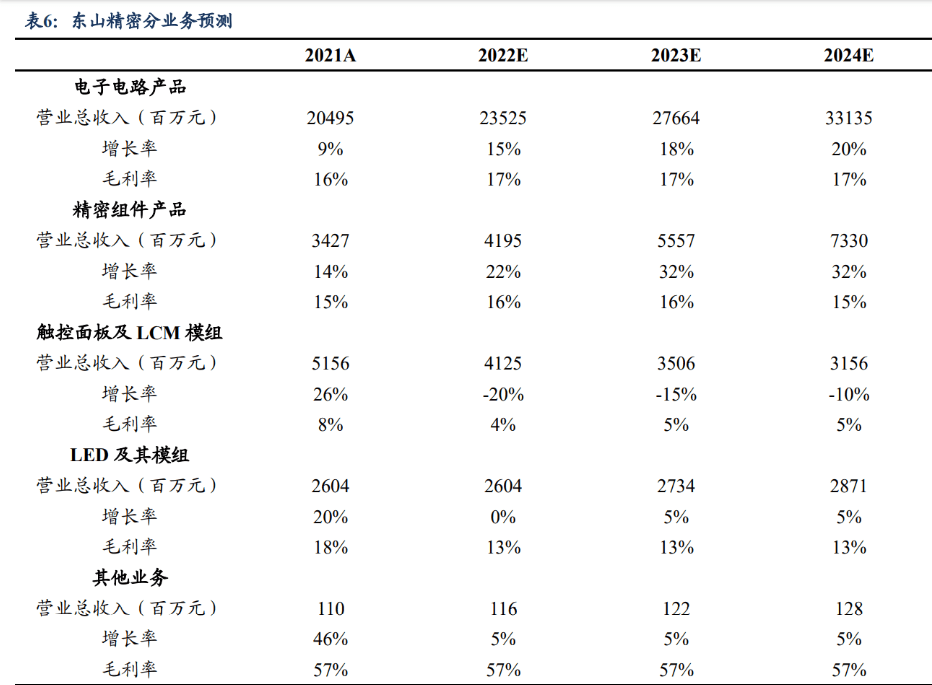 其他:其他业务为公司非主营业务,收入占比较低,我们预计其他业务会随着公司收入的增加而增加,2022-2024 年营收增速维持在 5%深圳东山精密。