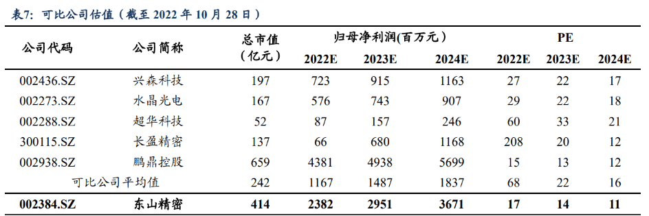 我们认为公司在印制电路板领域不仅处于行业领先梯队,同时将充分收益于新料号和新产品的导入实现快速增速,同时汽车电子业务卡位领先,有望凭借合金加工经验、通讯赋能、电子赋能、化平台优势、国际化五大优势实现快速增长,因此我们给予公司 2023 年估值可比公司平均值 22 倍,对应目标价 38 元深圳东山精密。