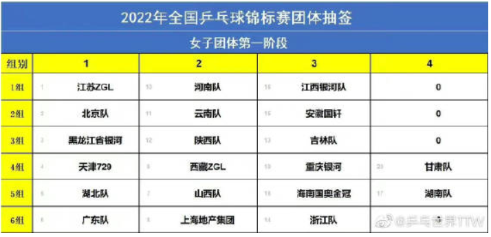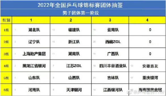 2022全国乒乓球锦标赛男子团体、女子团体第一阶段抽签表