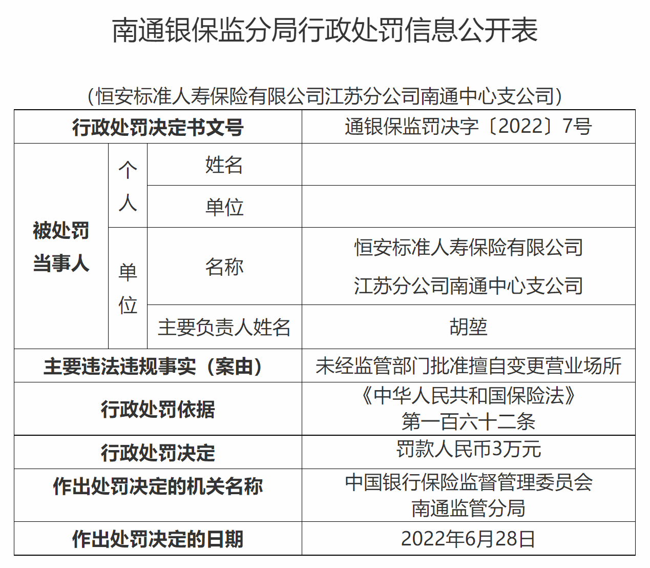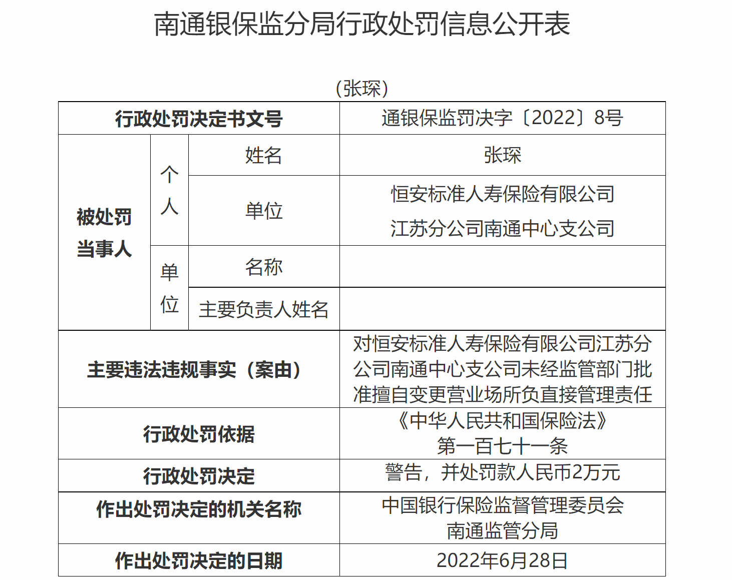 行政处罚信息公开表显示,恒安标准人寿保险有限公司江苏分公司南通中心支公司未经监管部门批准擅自变更营业场所,根据《中华人民共和国保险法》第一百六十二条,南通监管分局对其作出“罚款人民币3万元”的行政处罚决定;张琛因存在“对恒安标准人寿保险有限公司江苏分公司南通中心支公司未经监管部门批准擅自变更营业场所负直接管理责任”的违法违规事实,根据相关法律,南通监管分局对张琛作出警告,并处罚款人民币2万元恒安标准人寿保险有限公司。