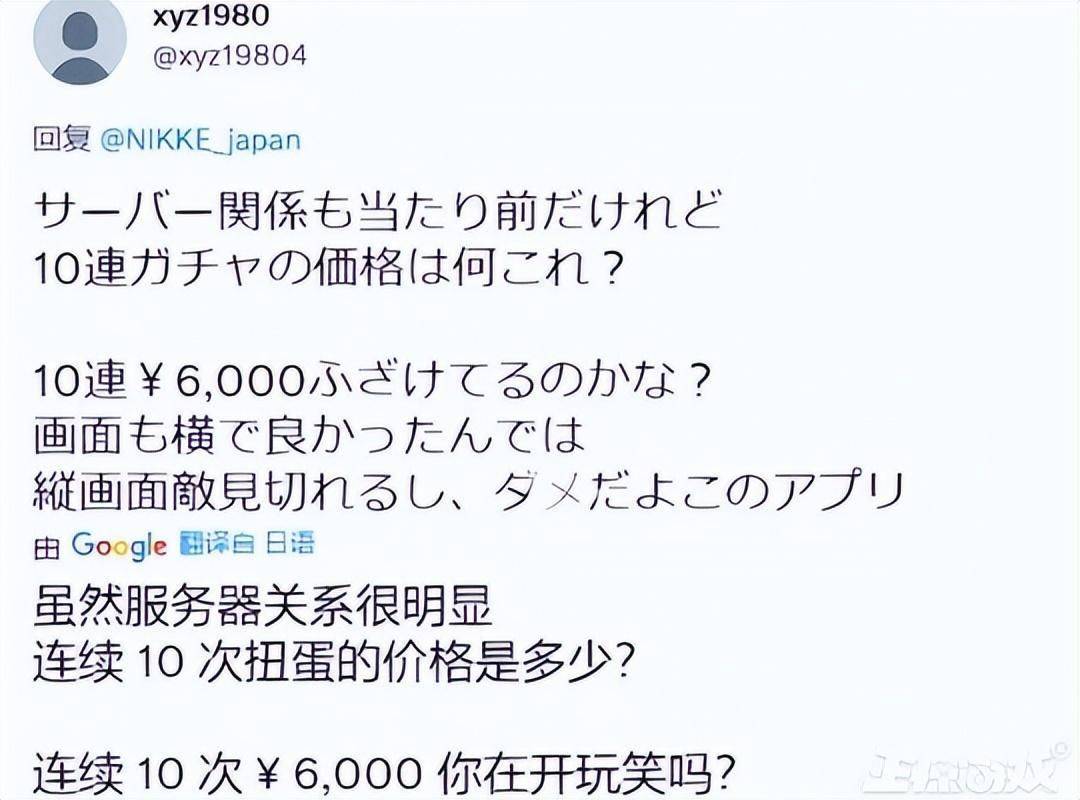 顺带一提,《Nikke:胜利女神》的抽卡定价,也引起了隔壁日本网友的不满,他们纷纷开始在推特上呼吁大家不要去下载体验。