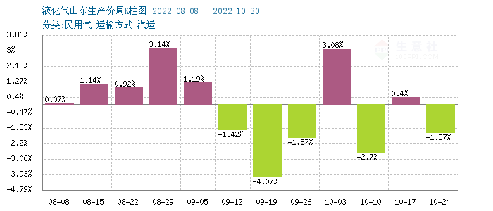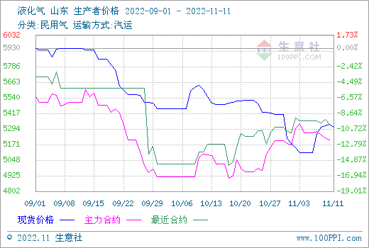 本周山东液化气市场整体上涨,周五出现小幅回调。据生意社数据监测,11月7日液化气民用山东市场均价在5256元/吨,11月11日均价在5310元/吨,周内上涨幅度为1.03%,较去年同期相比下跌2.96%。