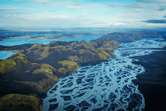冰岛的一条辫状河,由相连的河道网络组成,河道之间由小的、临时的岛屿分隔开。