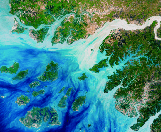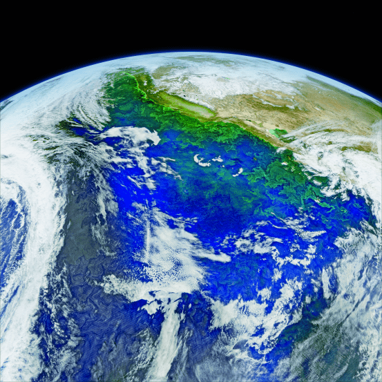 与美国东海岸上升流有关的浮游植物的卫星影像。营养物质上涌到海洋表面,滋养了这些微型植物,从而创造了一个高产的生态系统。