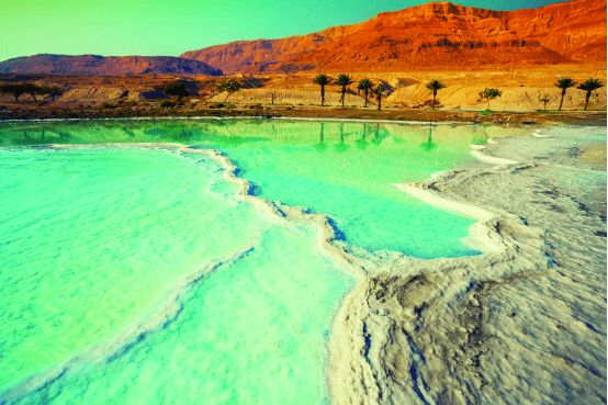 死海,位于世界上陆地海拔最低的约旦裂谷。它是世界上盐度最高的水体之一,平均盐度约为30%。