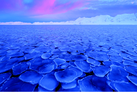 斯瓦尔巴群岛附近的莲叶冰,冰块之间的碰撞迫使一些冰块在其他冰块之上移动,并塑造了它们特有的凸起边缘。