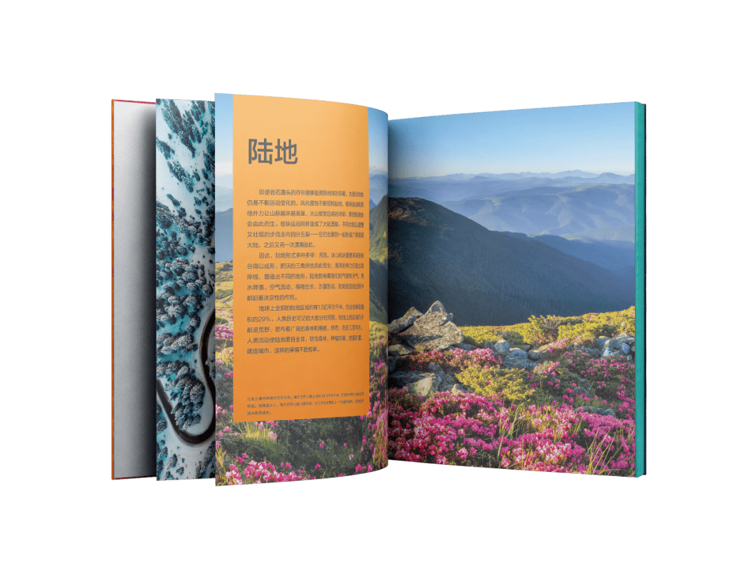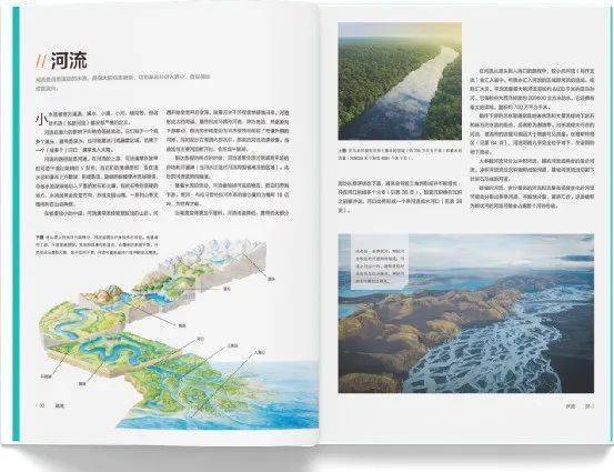 而这本书结构简单,体例清晰,全书只有陆地、海洋和大气三大章,每一章章扉都是跨页美图+便利贴式的概况介绍,用色鲜艳,给人视觉冲击,增加阅读趣味。