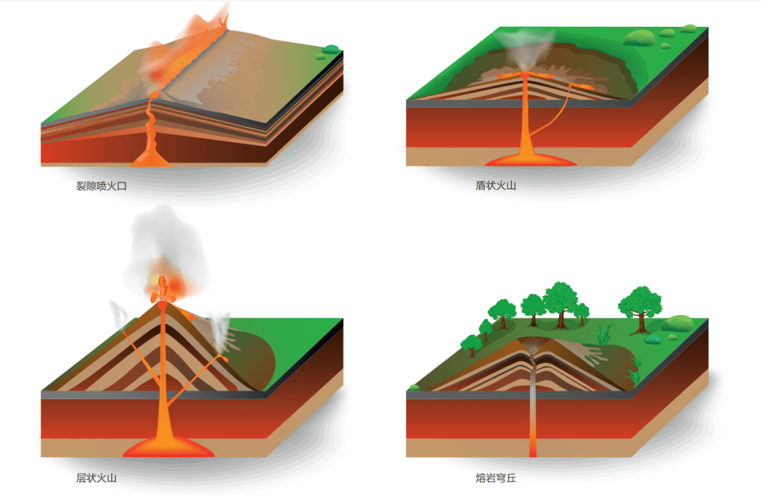 火山喷发示意图。火山喷发有几种形式,每一种喷发后都会产生特有的结构。