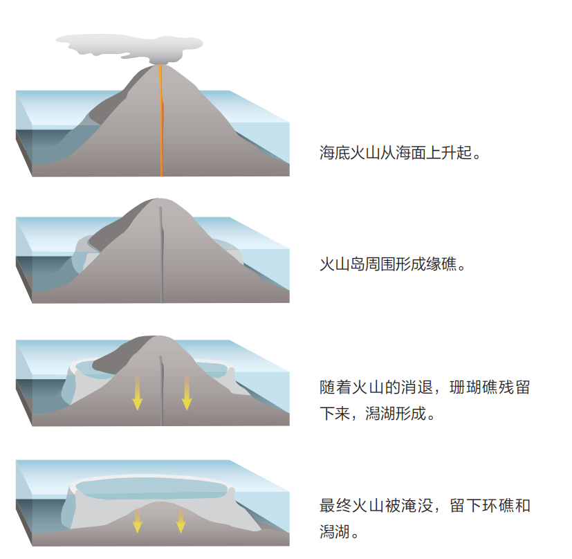 环礁形成示意图。环礁的形成始于火山岛周围缘礁的生长。最终,中央岛屿下沉,留下中央潟湖周围的珊瑚环礁。谭老师地理工作室综合整理
