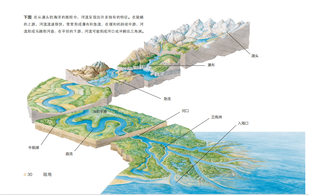 河流示意图。在从源头到海洋的旅程中,河流呈现出许多独有的特征。
