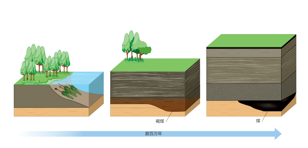 煤的形成示意图。树木和其他植被落入沼泽,经过数百万年慢慢转化为褐煤,然后依次是烟煤和无烟煤。