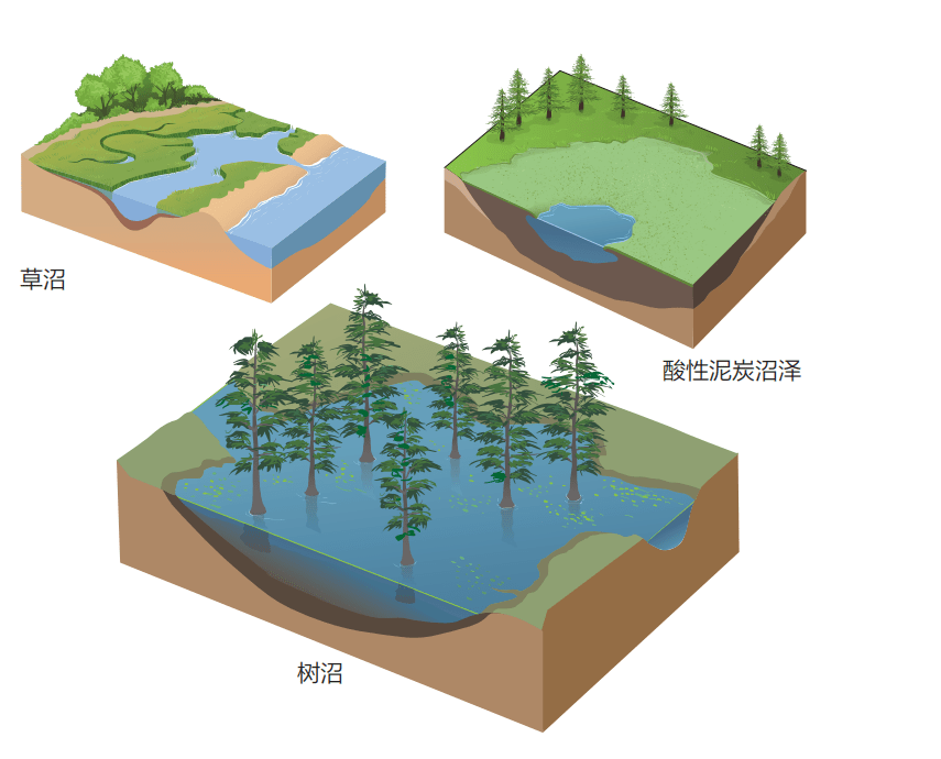 部分沼泽类型。草沼通常分布在湖泊和河流的边缘、河口和沿海地带。酸性泥炭沼泽是积聚泥炭的湿地。树沼的植被类型以树木为主。