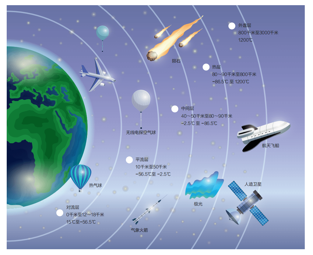 地球的大气层是分层的。科学家根据温度和成分等特征将其分为五个层次(从最低到最高):对流层、平流层、中间层、热层和外逸层。