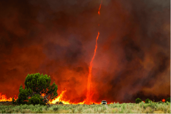 2020年8月,美国科罗拉多州大章克申附近的松树峡谷火灾中,一股火旋风从熊熊烈火中升起。