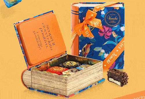 这款是Venchi专为小情侣设计的意大利之梦小铁书系列礼盒。六款精选巧克力口味,精致的书本铁盒包装,还印有精美插画,浓烈色彩混搭复古气质,是表达爱情的绝佳礼物。