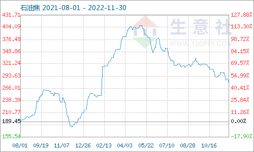 据生意社大宗榜数据显示,11月份国内主要地炼厂家石油焦产品主流均价月初为3739.00元/吨,月末为3564.00元/吨,月内下跌175元/吨,月跌幅为4.68%。