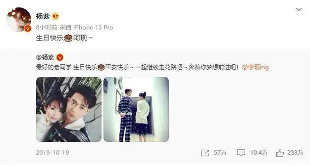 杨紫深夜高调发帖!10月19日凌晨,就在大家熟睡的时候悄然登上了热搜。她转发了3年前某男明星生日的消息。网友们的目光都集中在她的文案上:好甜!!这是怎么回事?原来19号是李现31岁生日,0:00紫妹发消息庆祝,配文:“生日快乐,阿现!”