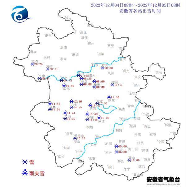 图1 4日08时-5日08时安徽省出雪时间分布图