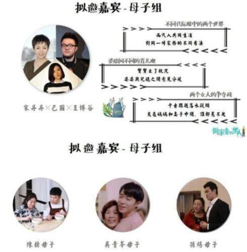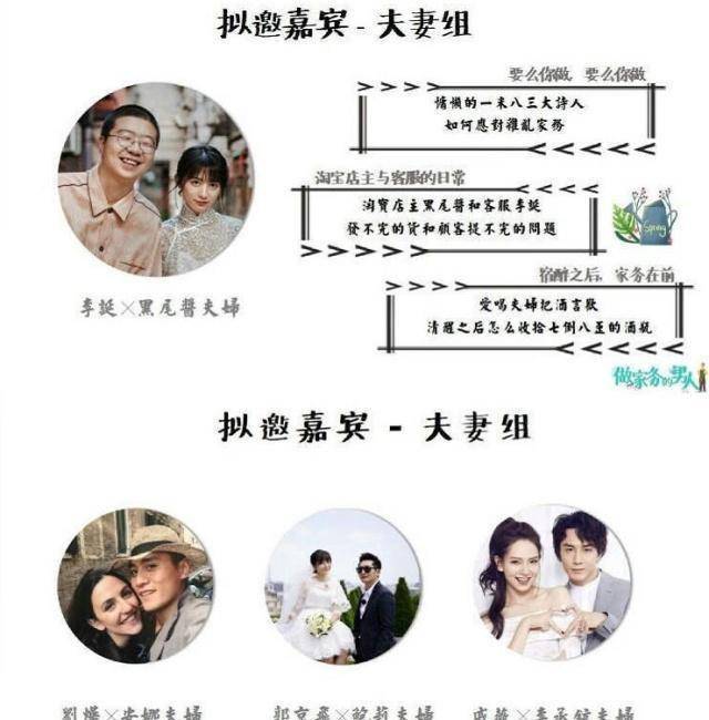 《做家务的男人》这档节目相应的嘉宾阵容分为夫妻组、母子组、实验组等三组类型的嘉宾。夫妻组的嘉宾有李诞和黑尾酱、刘烨和安娜戚薇和李承铉,还有《都挺好》中的郭京飞和他的妻子鲍莉,这样的每一对都是神仙组合,这档节目那可是相当的有看点。