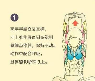 1,手掌交叉向上,掌心向上,手臂撑直绷紧保持10秒钟以上,配合呼吸。