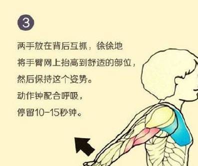 3,两手在背后手掌手指交叉而握,掌心相对并不外翻,尽量抬高保持十秒钟并配合呼吸。