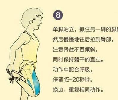 5,单只脚站立,另一只腿向后弯曲到后脚跟碰到臀部,保持住15秒钟,配合呼吸。