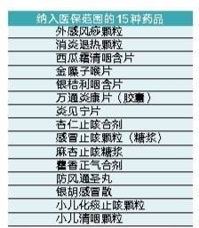 此次临时纳入医保范围的15种药品为:外感风痧颗粒、消炎退热颗粒、西瓜霜清咽含片、金嗓子喉片、银桔利咽含片、万通炎康片(胶囊)、炎见宁片、杏仁止咳合剂、感冒止咳颗粒(糖浆)、麻杏止咳糖浆、藿香正气合剂、防风通圣丸、银胡感冒散、小儿化痰止咳颗粒、小儿清咽颗粒。