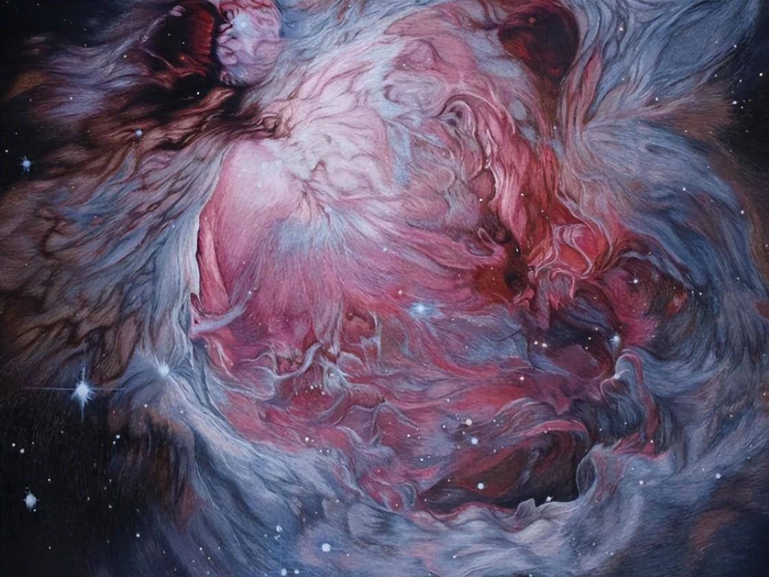 为了呈现立体逼真的效果,陈英华在针法和丝线上下足了功夫。用细如蛛丝的绣线来描绘星云缥缈的云雾感,用独创的针法来表现宇宙中亮光的星星点点以及喷发感。经过大半年的努力,陈英华完成了这幅《蟹状星云》,这也是她宇宙星空系列的第一幅作品。在之后的两年多时间里,她又用刺绣独特的语言和美感,完成了16幅星空宇宙系列作品。