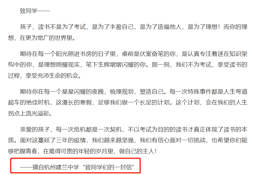 2022年12月22日,杭州建兰中学发布致同学们一封信,但是读书不是为了考试,并暂停网课教学,引起了社会广大反响。主要舆论方向评价为有温度有态度,在疫情当前的背景下,暂停网课教学,从表面上看确实会对当前孩子的学习进度产生一定的影响,但为什么会有这么多人支持并拥护这样的决定,学校决策的背后又有哪些对于中学教育的启示,或许这是值得我们深思和讨论的地方。