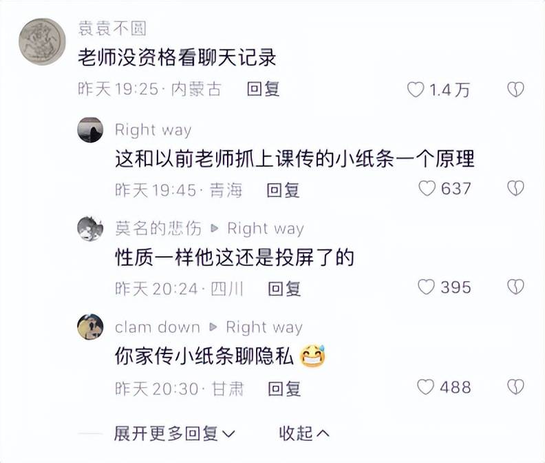 表示赞同的网友表示,“这和以前老师抓上课传的小纸条是一个道理,之前传小纸条涉及到隐私了吗?”