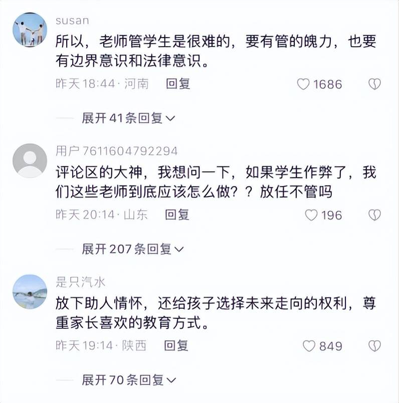 也有的网友表示,“现在的老师管学生是很难的,要有管的魄力,也要有边界意识和法律意识”。
