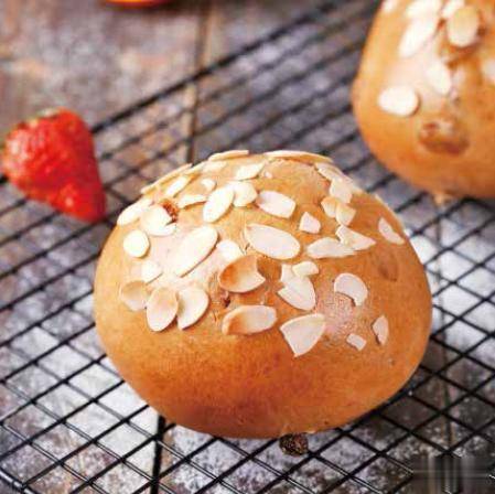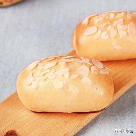 面团:高筋面粉200克,细砂糖11克,奶粉8克,酵母粉2克,牛奶35毫升,水90毫升,无盐黄油18克,盐4克;表面装饰:全蛋液适量,杏仁片适量