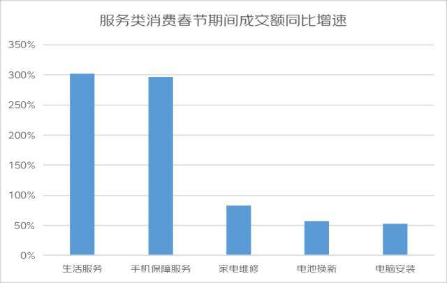同时,除了在春节期间购买心仪好物外,服务消费也受到了众多消费者的喜爱,春节期间生活服务、手机保障服务、家电维修、电池换新和电脑安装的成交额同比增长分别达302%、296%、83%、57%、53%。
