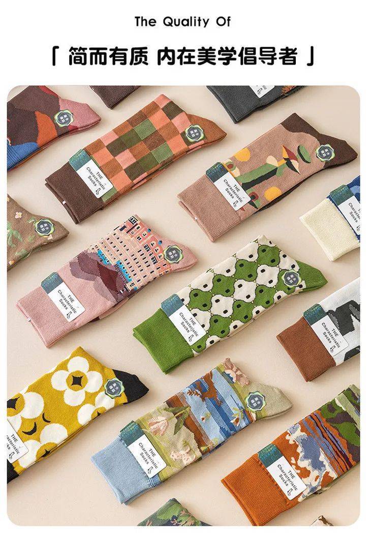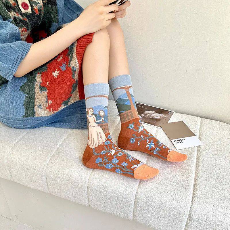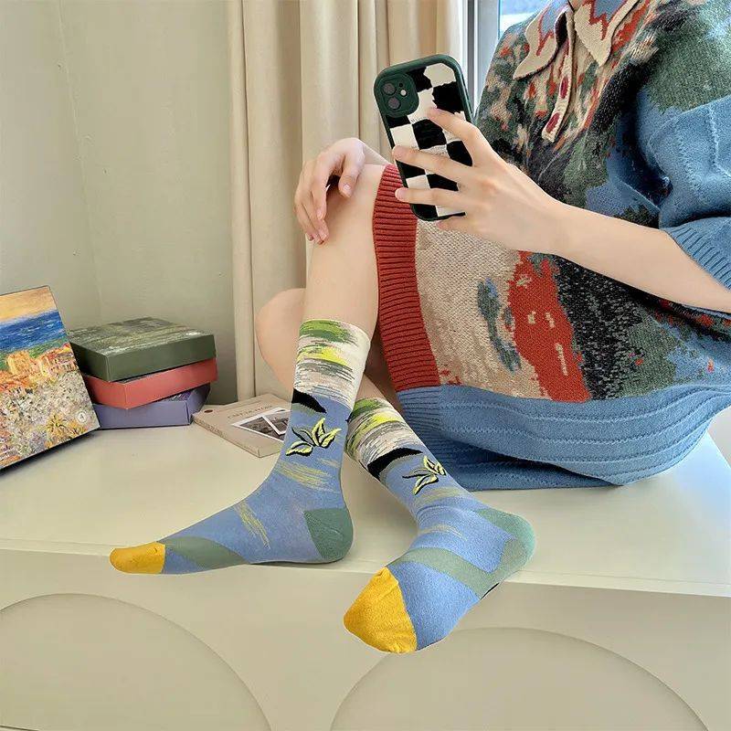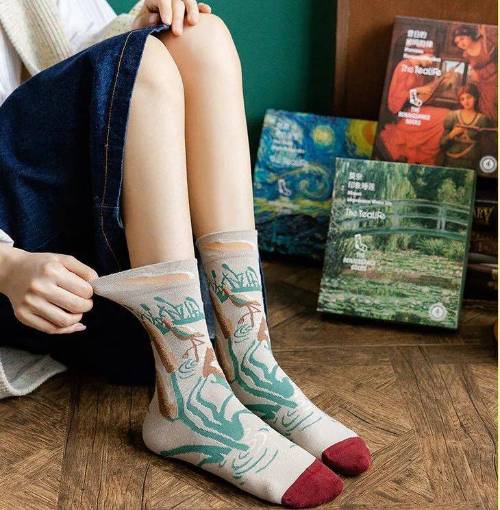 梵高&莫奈油画中筒袜,将脚腕、部分小腿包裹起来,即使是阴雨天气,也不会感受阴凉, 具备一定的保暖性。