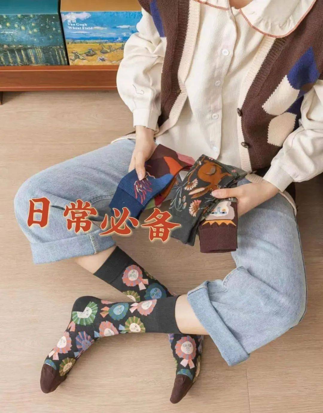 梵高系列的袜子偏暖调,《麦田》《向日葵》很适合搭配棕调衣服, 一身暖色非常和谐,袜子上的图案又为整身搭配增加了复古气息。