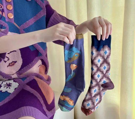 莫奈系列的袜子更多地出现了蓝灰、紫色调,深色穿搭搭配起来,略略亮眼却又不会扎眼, 很适合喜欢低调又带有设计感的姐妹。