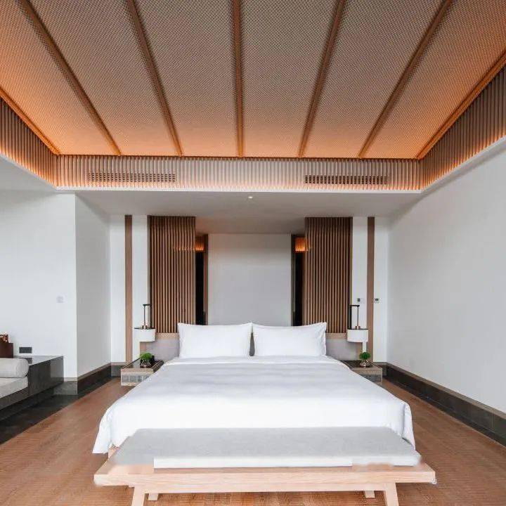 酒店中,每个空间的打磨和用材,多取自本地,将大量宜兴的材料融入空间设计中,茶香味弥散卧室的各个角落。使建筑不仅与自然相融合,也让时尚与度假相融合。