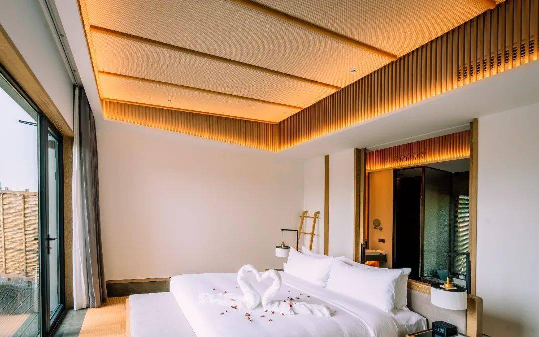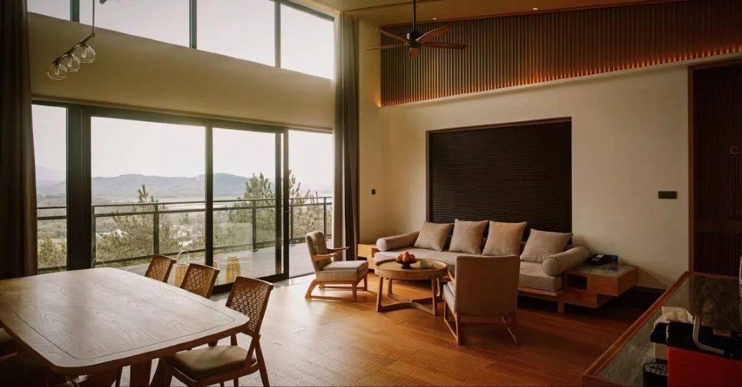 设计师让野奢元素与当地文化特色融合,客房里茶香满室。推窗即是湖景/茶园景观。坐于茶桌之上,品茗、放空、悠然自得。