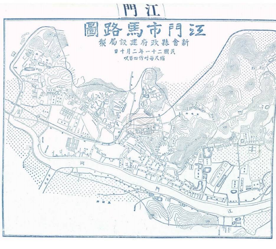 1932年江门市区马路图,新会县政府建设局制,此图并非上北下南布置,而是将江门市区街道放在了地图主体位置,整体朝向为上西北而下东南。《新会建设特刊》,1933年。
