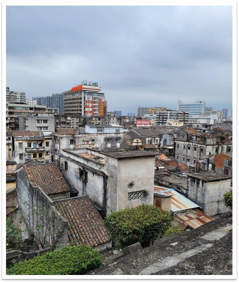 从中山公园俯旧街区,近处是骑楼和岭南民居屋顶,中景则有九十年代兴建的高层建筑,远处的蓬江对岸则有更晚近的新式高层住宅楼。蔡炯昊摄