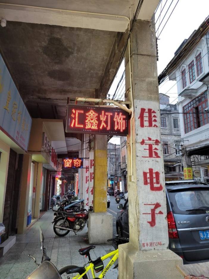 骑楼上的广告灯箱和店铺招牌,经营的业务多为窗帘、电子设备、灯具、音响等。蔡炯昊摄