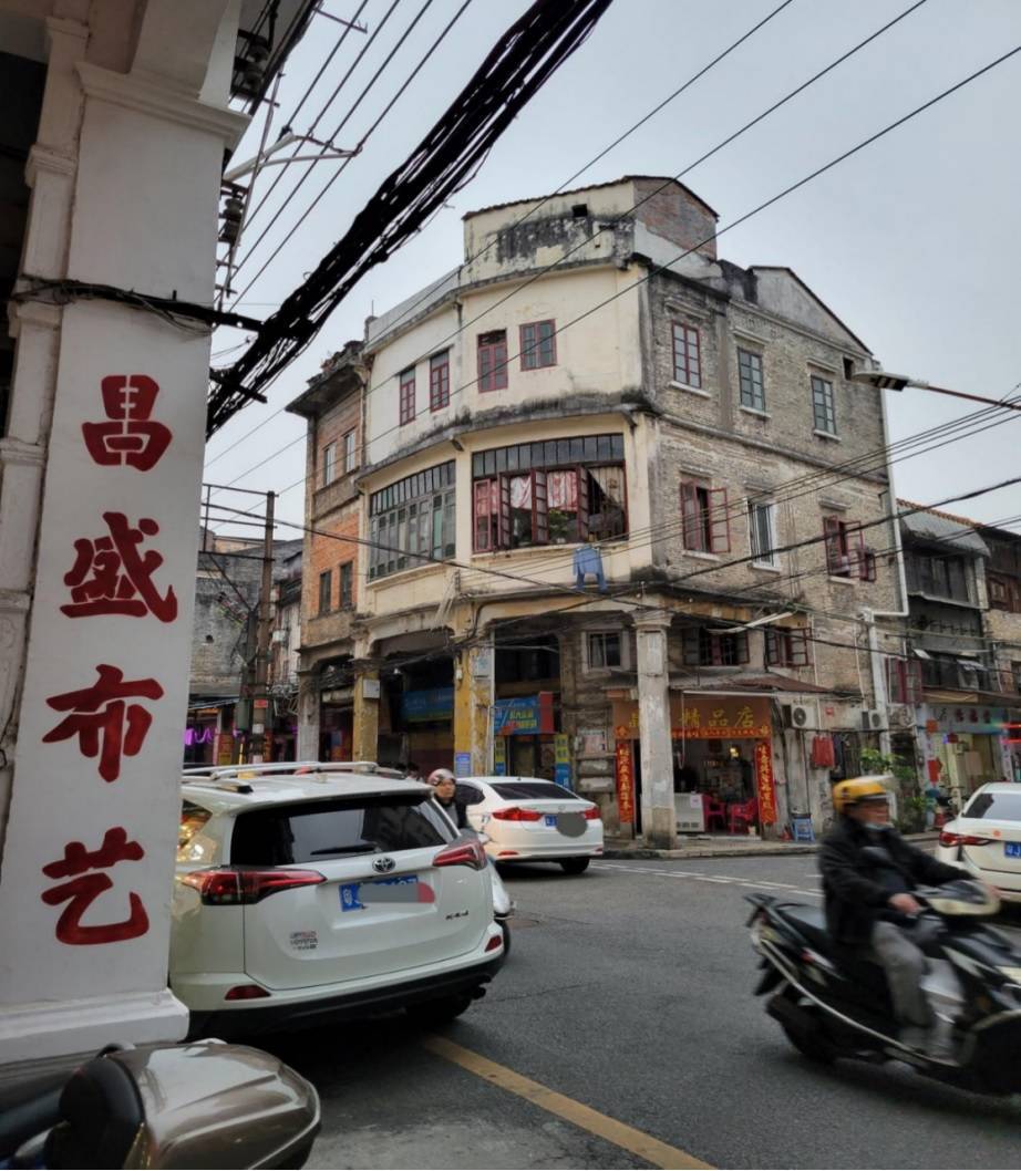 游客的相机偶尔会打扰到汽车和摩托车通过,但更多的时候,游客和当地居民并行不悖,互不干扰。这样的旧城区生态,在当今中国变得非常罕见。在这个空间之中,并没有进行改造性的保护,将某个大写历史的切片或者关键时刻强行凝聚在变动不居的实际生活空间之上(如汕头小公园街区在改造之后变成了统一的“近代风貌”,并挂上写有汕头开埠年份:“1860”字样的灯笼)。反而因为地方历史中的偶然性因素:改革开放之后的第二次繁荣,大大延迟了这个片区的自上而下的旧城更新。如果用街景地图中的历史影像对比,会发现甚至一直到本世纪的第二个十年中,这些街区仍保持了相当程度的繁荣。仔细观察,当时许多店铺的招牌比今天要新不少,我甚至怀疑现在有些店铺的招牌是为了营造老街区景观而有意“做旧”,我就发现一家“昌盛布艺”在2014年的街景照片中,店铺招牌是当代的广告箱式,而字体也是黑体红色。而今天其招牌变为带有“民国风”的楷体书写,并且直接写在骑楼柱子上,不再使用广告箱,似乎是为了营造某种“风貌”,但这种景观营造过程是低调的,不破坏空间和社会肌理的。此外,整个街区的保护性铭牌,一般落款的时间是2019年,可以推知在2019年,当地曾经启动了对这些近代建筑的保护和更新工程,并配上了写有说明文字的铭牌,工作做得非常细致,一条街、一栋标志性建筑物的变迁,都附有文字。这些工作,让人对在地的历史变迁有了更清晰的认知。但这次保护和更新并没有破坏原有的空间肌理和居民生活样态,也就是说,老街原有的经营业务虽然略显颓势,但当地基本上并没有采用一种士绅化的策略对整个街区进行更新改造,原有居民并未被迁出,而街区的转型与当地新的收入来源仍然与在地居民连接紧密。