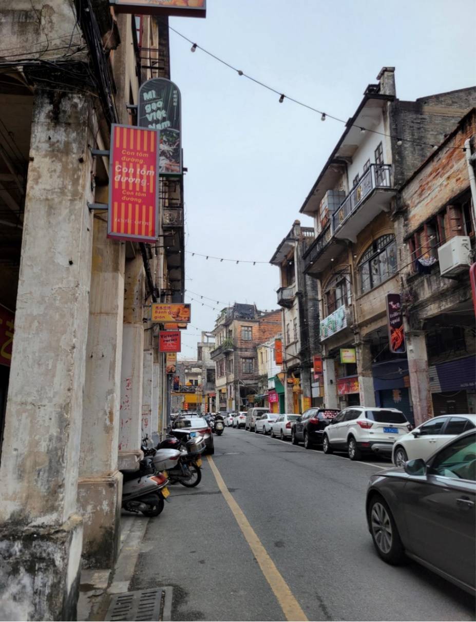 非常有意思的是,在水街北段,不少骑楼上都挂上了写有泰文和越南文的餐馆招牌,但骑楼铺面的实际业务与餐饮无关,也并非泰国或越南人士经营。查阅网上的资料可知,这些外文招牌是为拍摄电影所搭建的布景,但在电影拍摄结束之后,当地商户并未将外文招牌取下,整条街道外文与中文招牌杂陈的景观,让人恍若置身海外唐人街中。承接影视剧拍摄的业务,在某种程度上使得街区在整体上变得像是“布景”,似乎在修改街道和建筑原本的“文脉”。但正如前面所提到的,这个街区和建筑物本身类似于“有机体”,其具有生命力的体现正在于仍然可以不断“新陈代谢”而呈现新的样态,但不至于停滞而死亡。